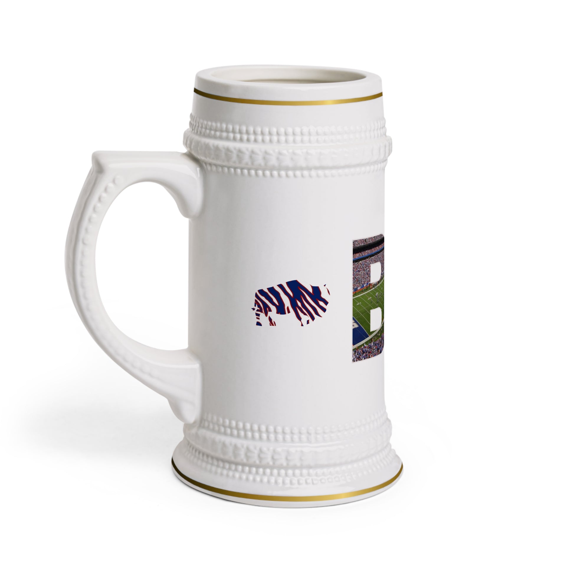 Cheers to a Funday Sunday rooting on the Buffalo Bills. This stein is perfect for creating a more authentic drinking experience, whether in a bar, at a tailgate party or at home. These 22oz white stein mugs are made from 100% ceramic. The mugs are treated with an ORCA coating that makes sure your original designs are printed in vibrant colors and high resolution.