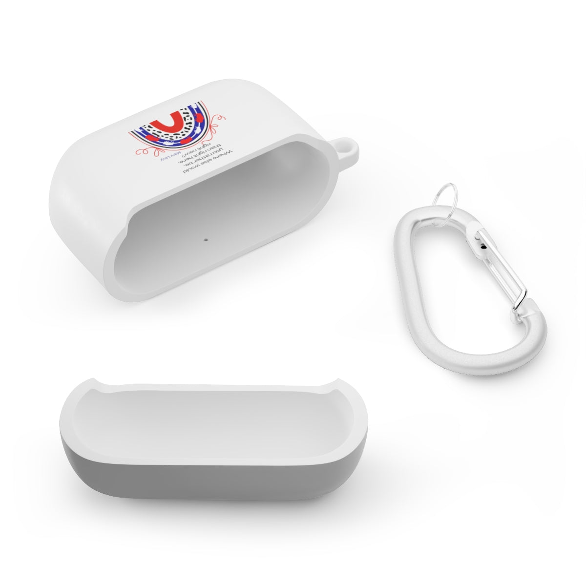 This customBUFFalove AirPods cover safeguards your AirPods/AirPods Pro against bumps, scratches, and drops. With each personalized AirPod case you also get a metal carabiner for secure, effortless transportation. Compatible with the regular and wireless charging case for Airpods and AirPods Pro. Both AirPod and Airpod Pro cases are available in 5x colors: White, Navy, Pink, Mint, and Black.