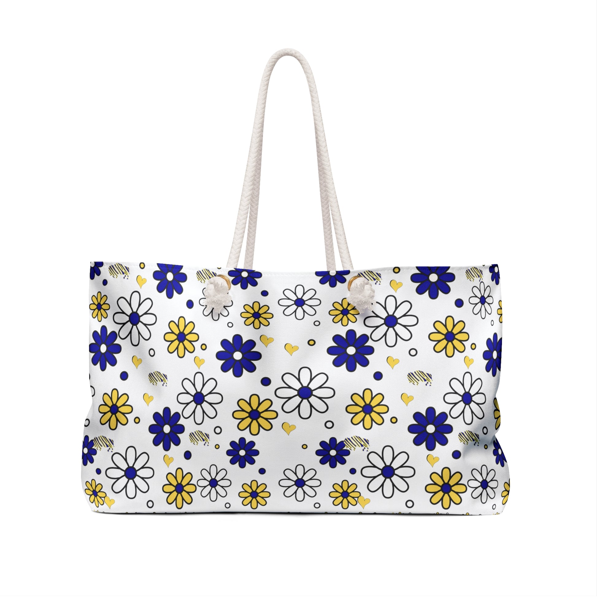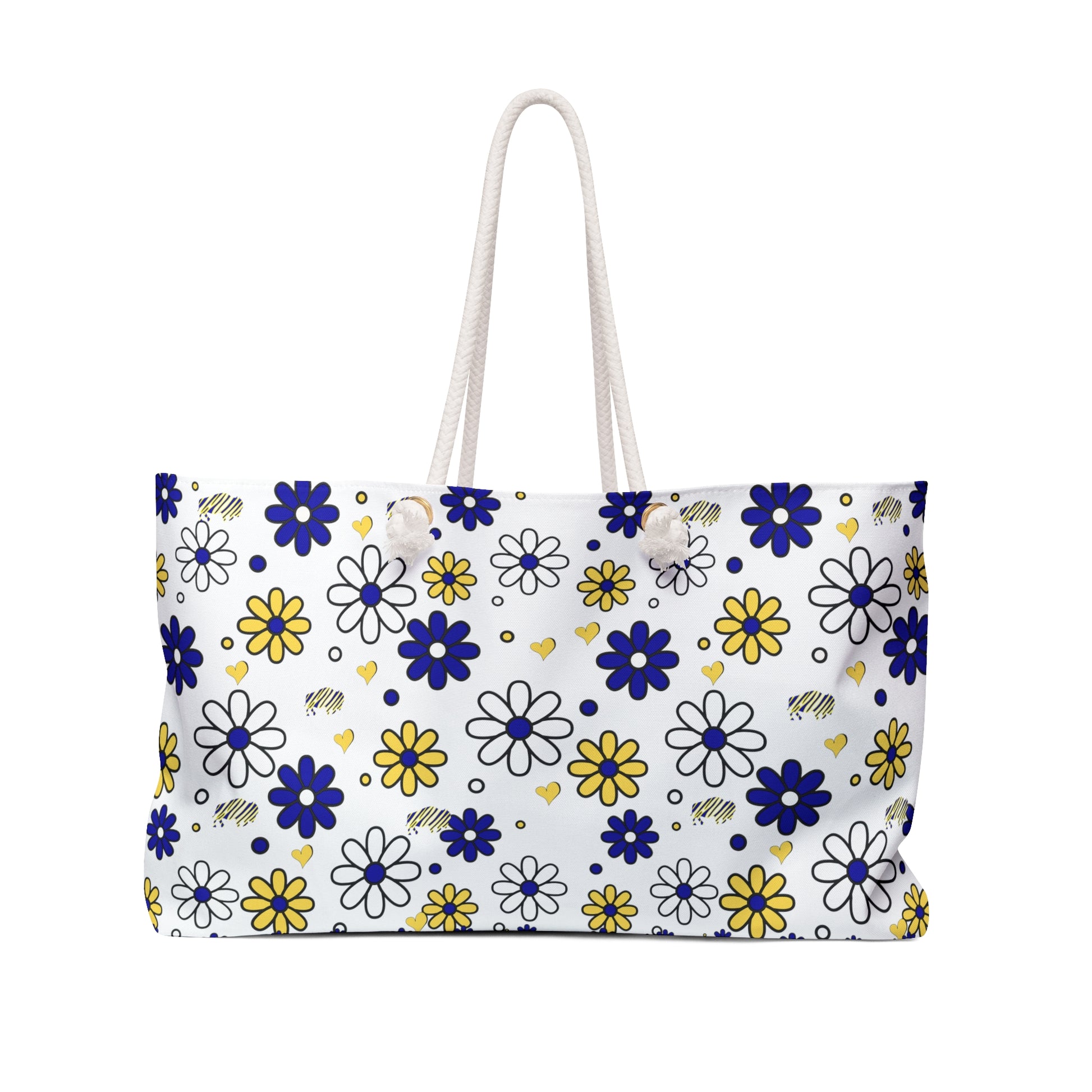 Introducing our "Buffalo Flower Power" Oversized Weekender Tote, the ultimate companion for your weekend adventures, whether you're headed for an overnight trip, a thrilling game day, a relaxing day at the beach, or exploring the town. This spacious and durable tote is designed to hold all your personal items and is conveniently carried by its thick rope handles.
