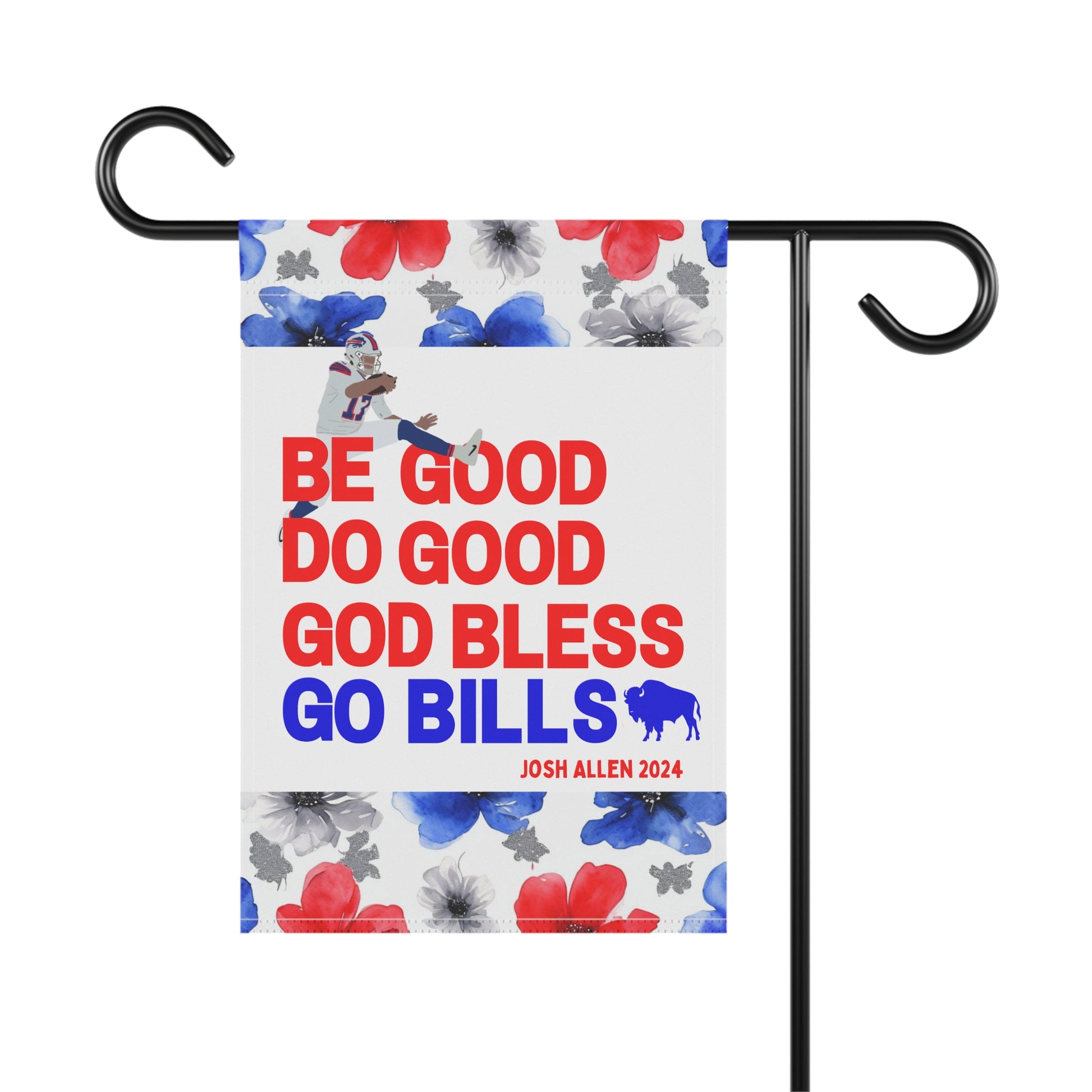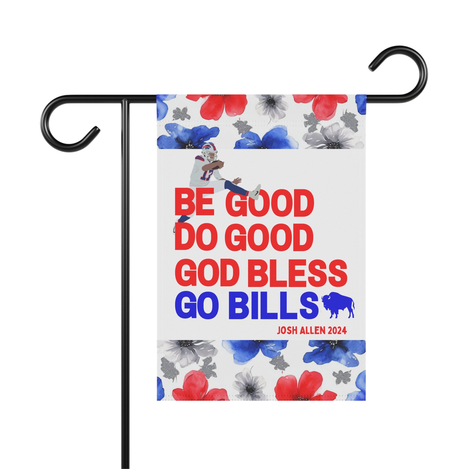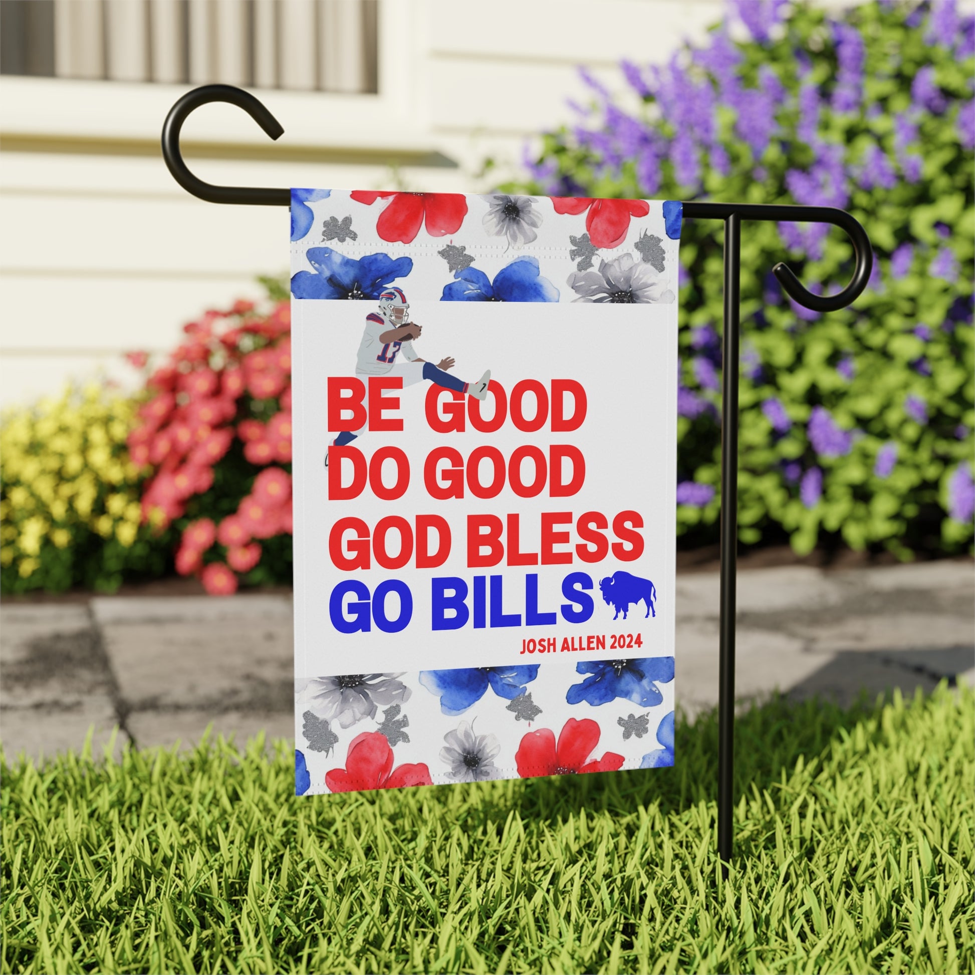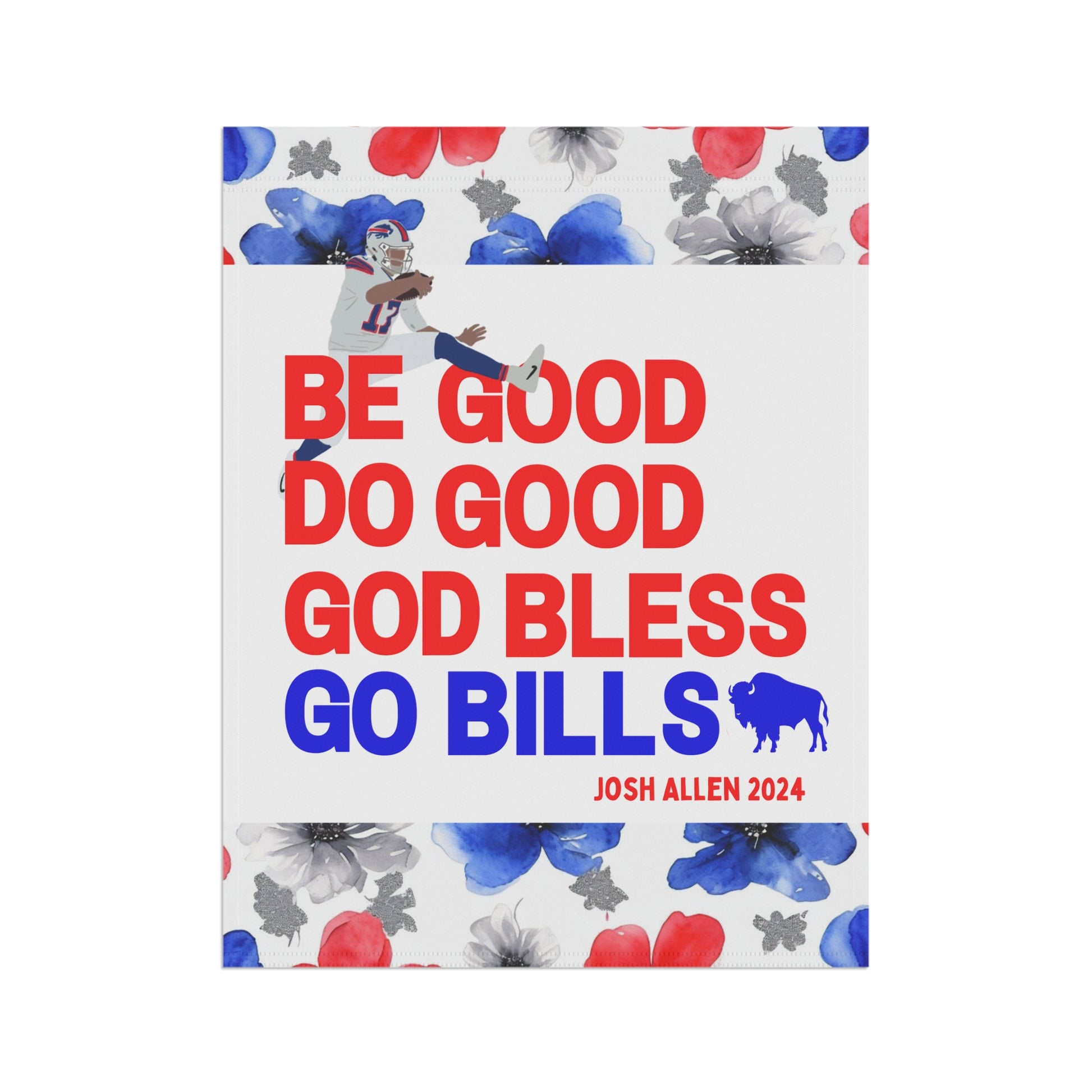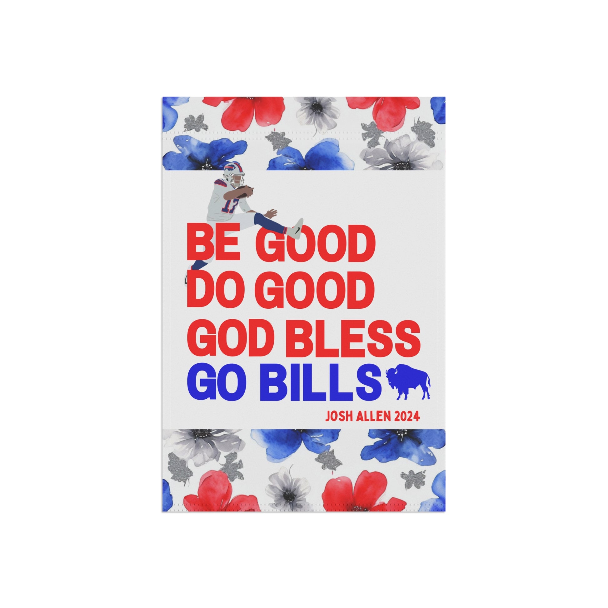 Transform your yard into a charming, welcoming retreat with our beautifully decorated Garden Flags! Designed to blend seamlessly with nature, these flags add a pop of vibrant color and a personal touch to your garden, porch, patio, or entryway. This garden flag is adorned with a beautiful watercolor floral design highlighted by the iconic Buffalo football color scheme. The flag proudly boasts your pride for the Buffalo QB1 with his iconic MVP speech closer, "Be Good, Do Good, God Bless, Go Bills". Whether you're celebrating the seasons, showing off your Bills style, or creating a warm welcome for guests, this durable, lightweight flag is the perfect accent for any outdoor space.
