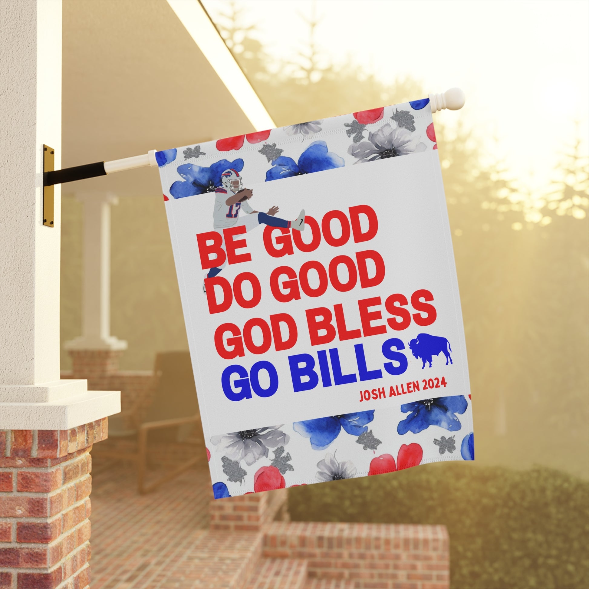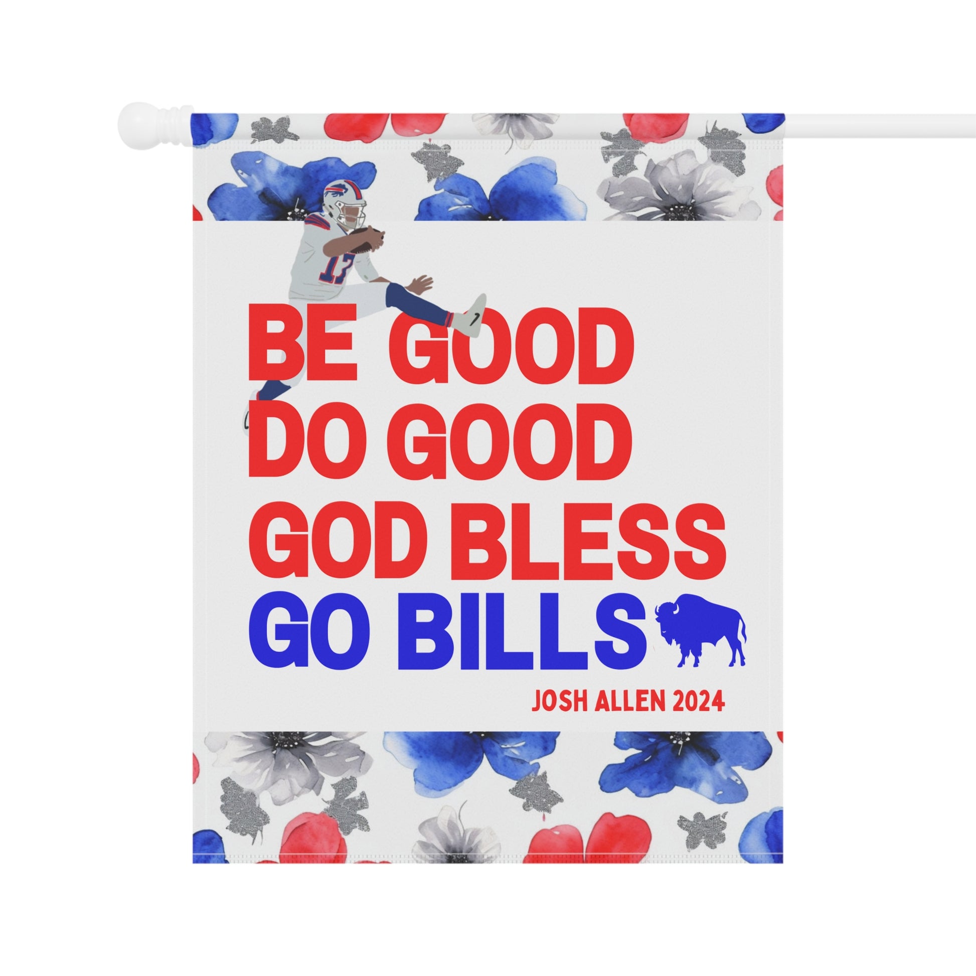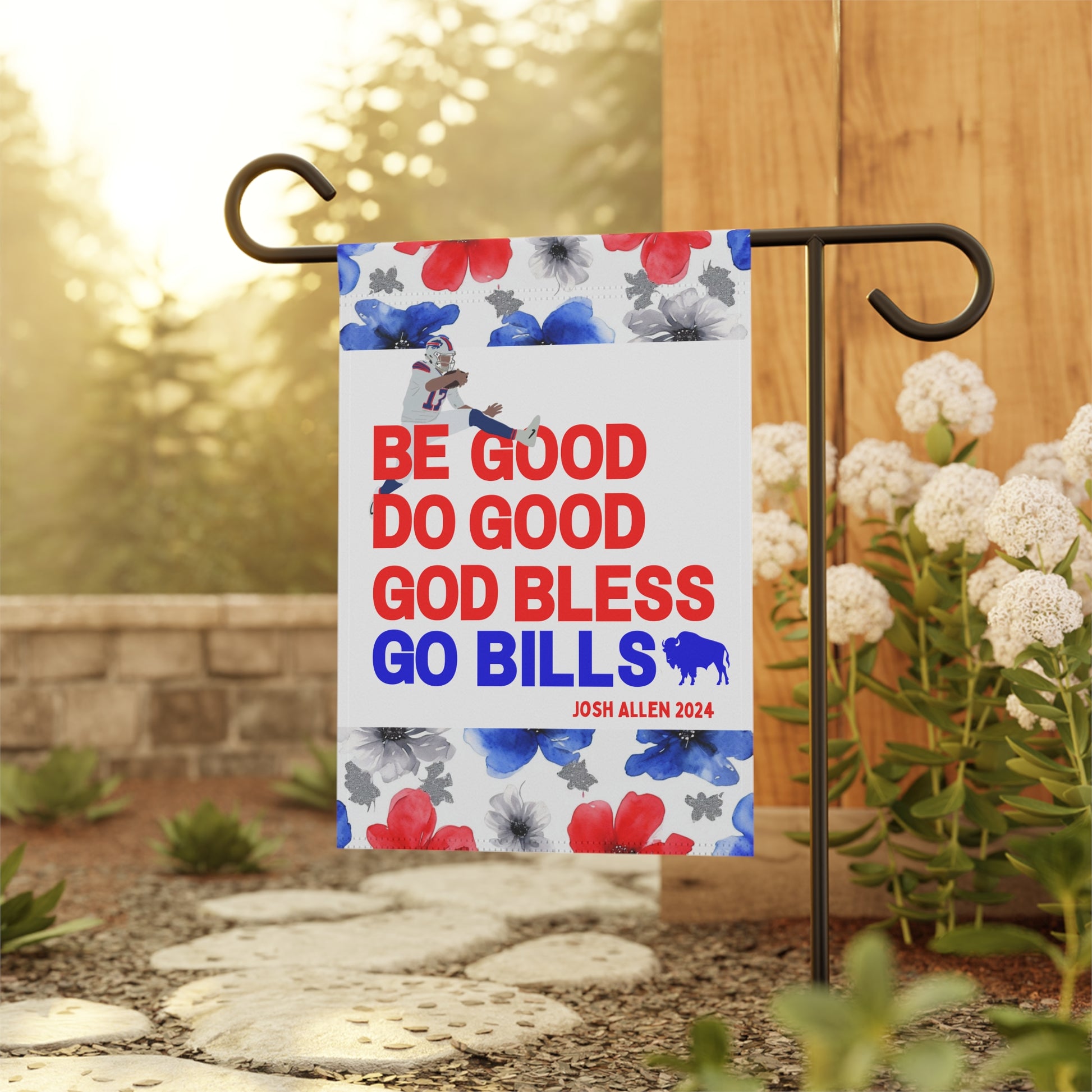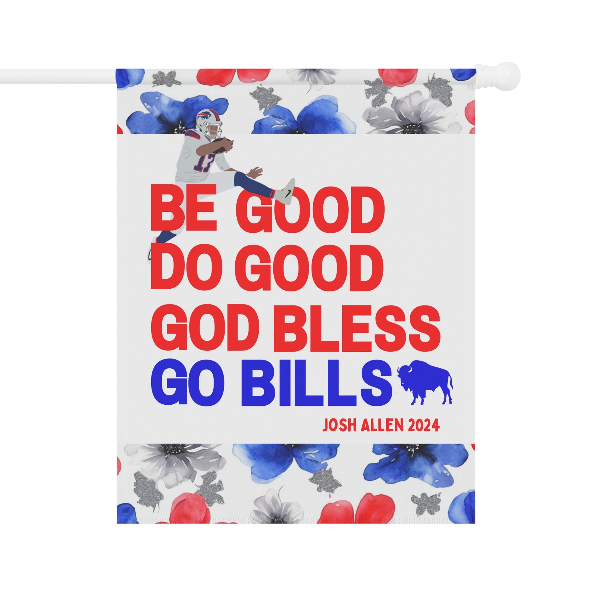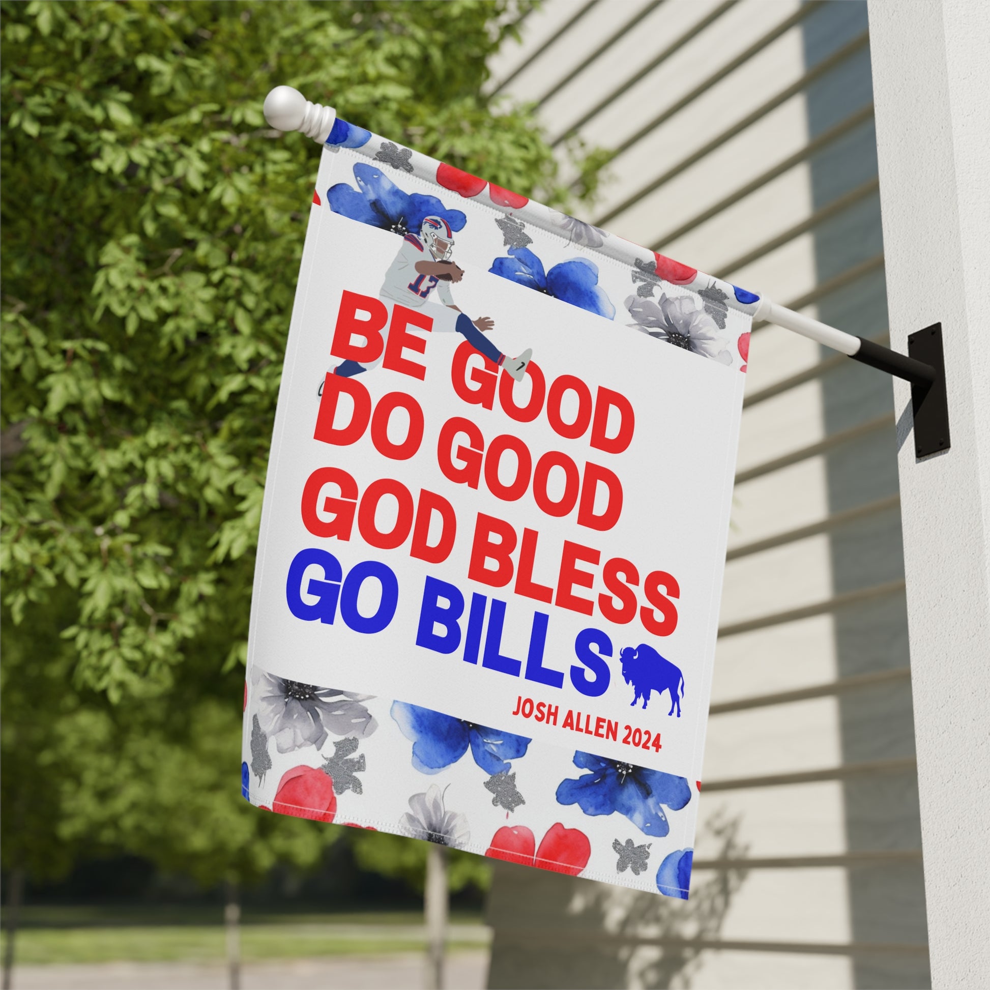 Transform your yard into a charming, welcoming retreat with our beautifully decorated Garden Flags! Designed to blend seamlessly with nature, these flags add a pop of vibrant color and a personal touch to your garden, porch, patio, or entryway. This garden flag is adorned with a beautiful watercolor floral design highlighted by the iconic Buffalo football color scheme. The flag proudly boasts your pride for the Buffalo QB1 with his iconic MVP speech closer, "Be Good, Do Good, God Bless, Go Bills". Whether you're celebrating the seasons, showing off your Bills style, or creating a warm welcome for guests, this durable, lightweight flag is the perfect accent for any outdoor space.