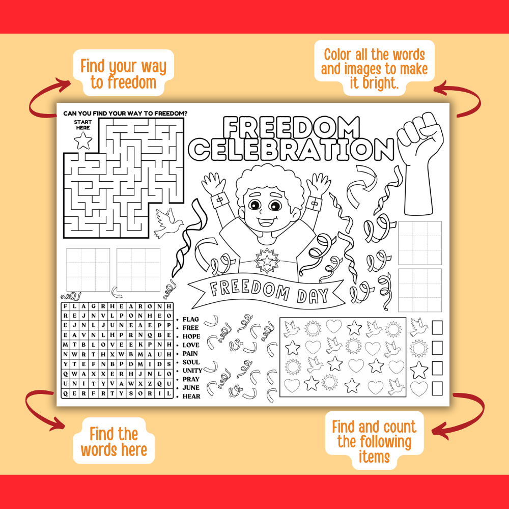 In addition to the informational booklet, the packet includes 5 interactive placemat activity pages filled with puzzles, word searches, coloring sections, and reflection prompts. These activities help reinforce key concepts while encouraging meaningful discussions about freedom, equality, and African American history.
