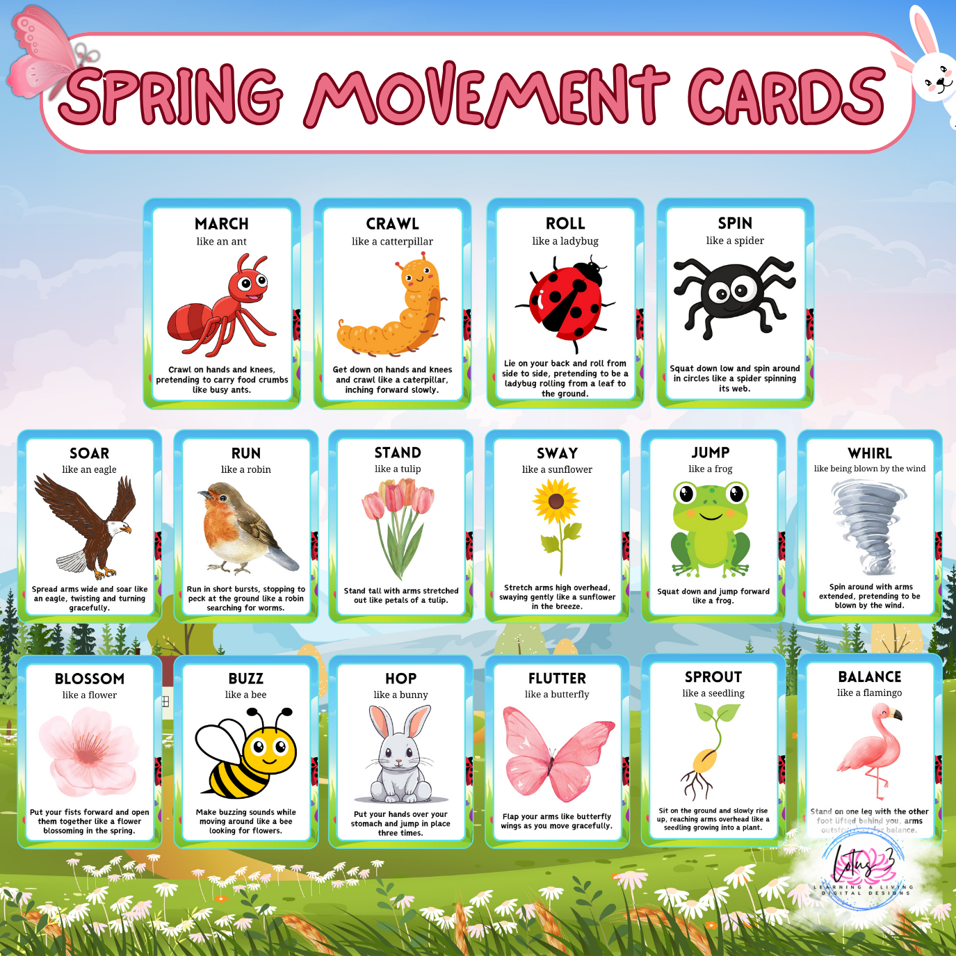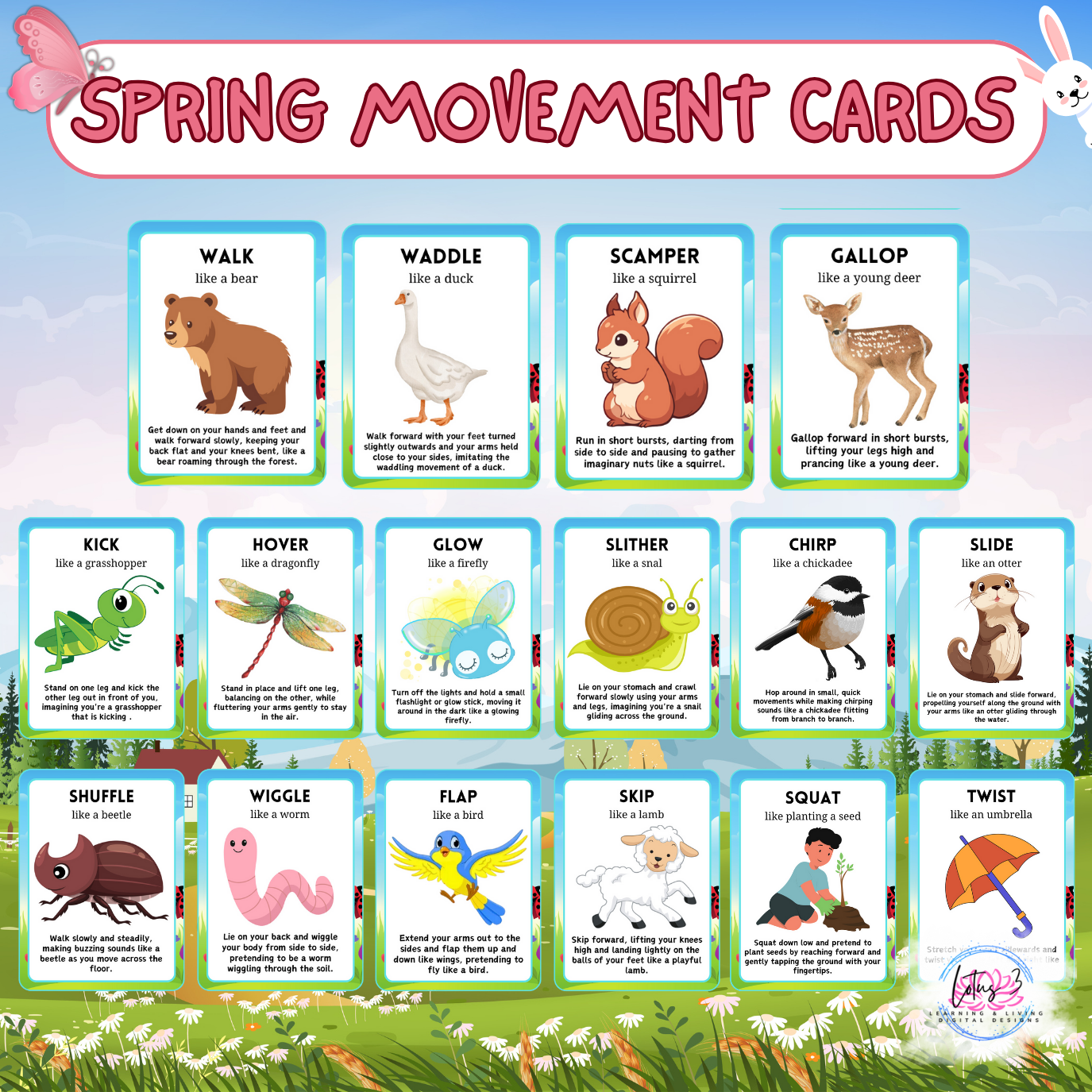 Inside this packet, you'll find a delightful assortment of movement activities inspired by the sights and sounds of the season. From pretending to fly like a butterfly to hopping like a bunny, each card is thoughtfully crafted to get students up and moving while fostering creativity and imagination.
