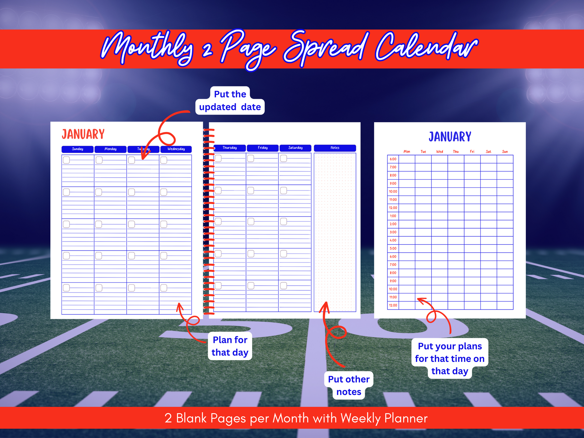 Keep track of your monthly budget, plan your meals for the week, schedule your workouts, and jot down your favorite books to read – all while representing your favorite NFL team. Plus, with ample space for notes and reminders, you'll never miss a beat when it comes to staying organized and focused.