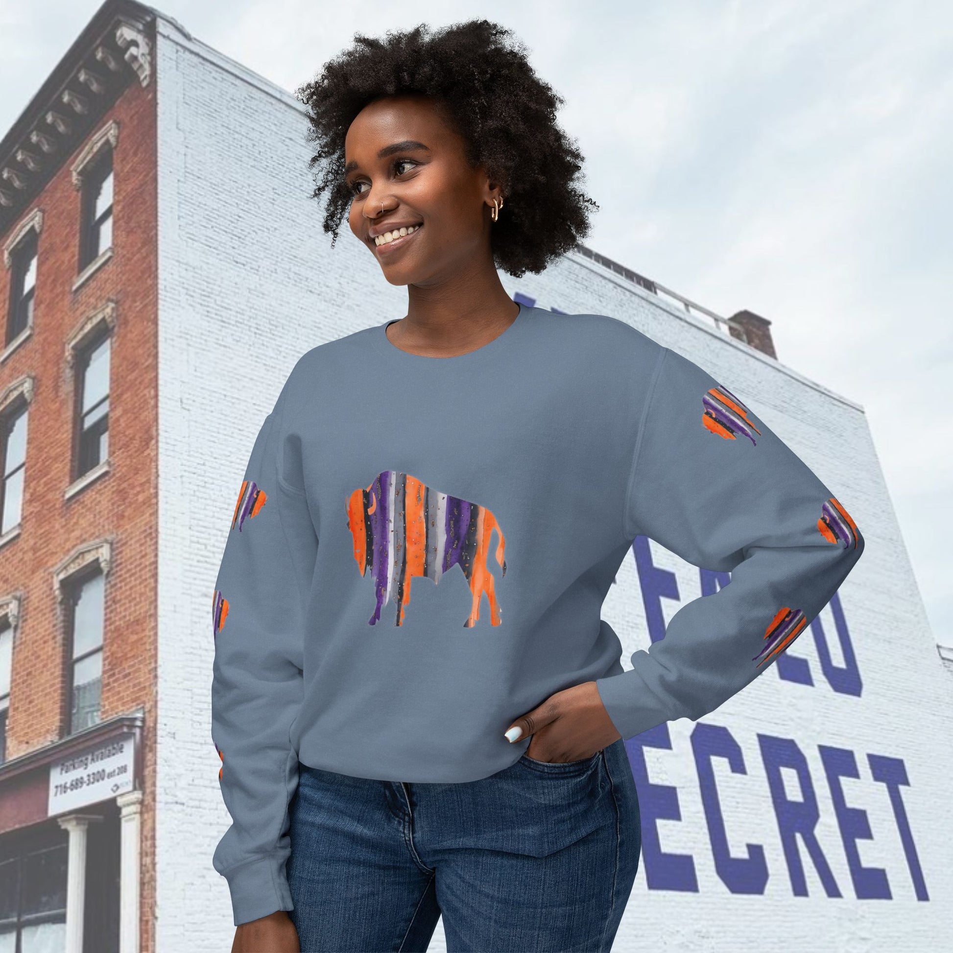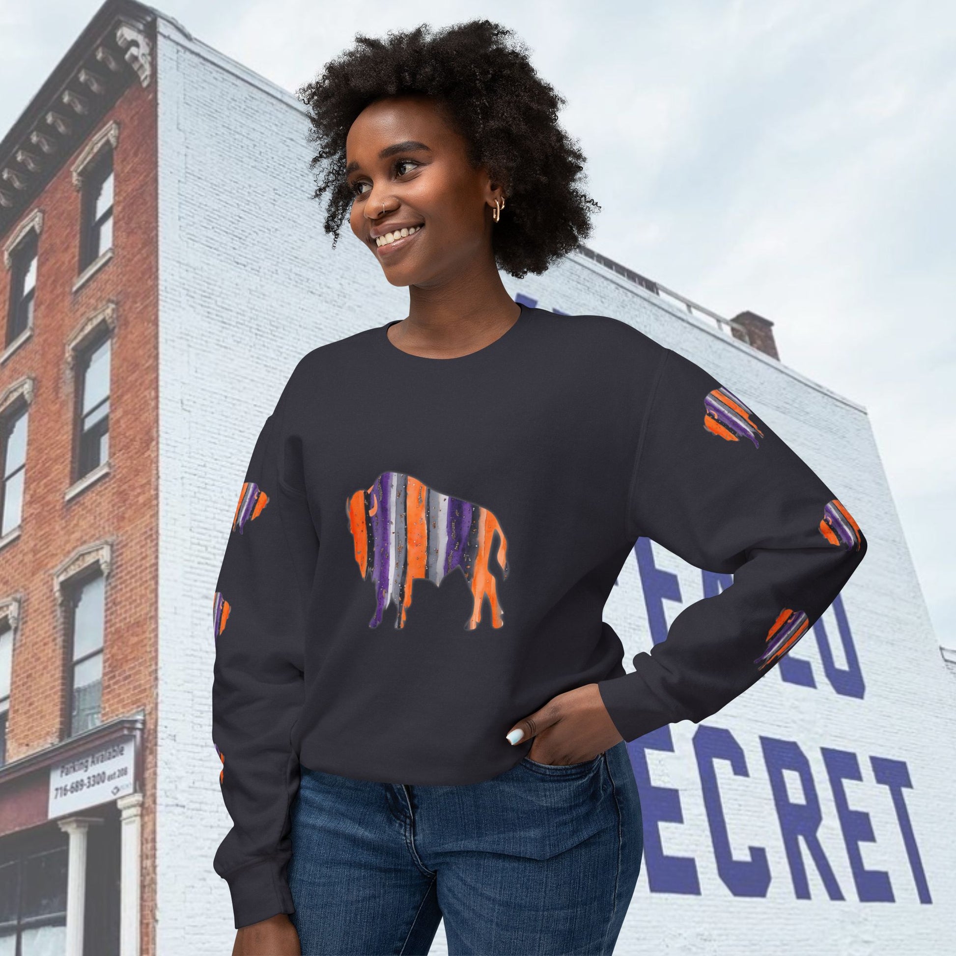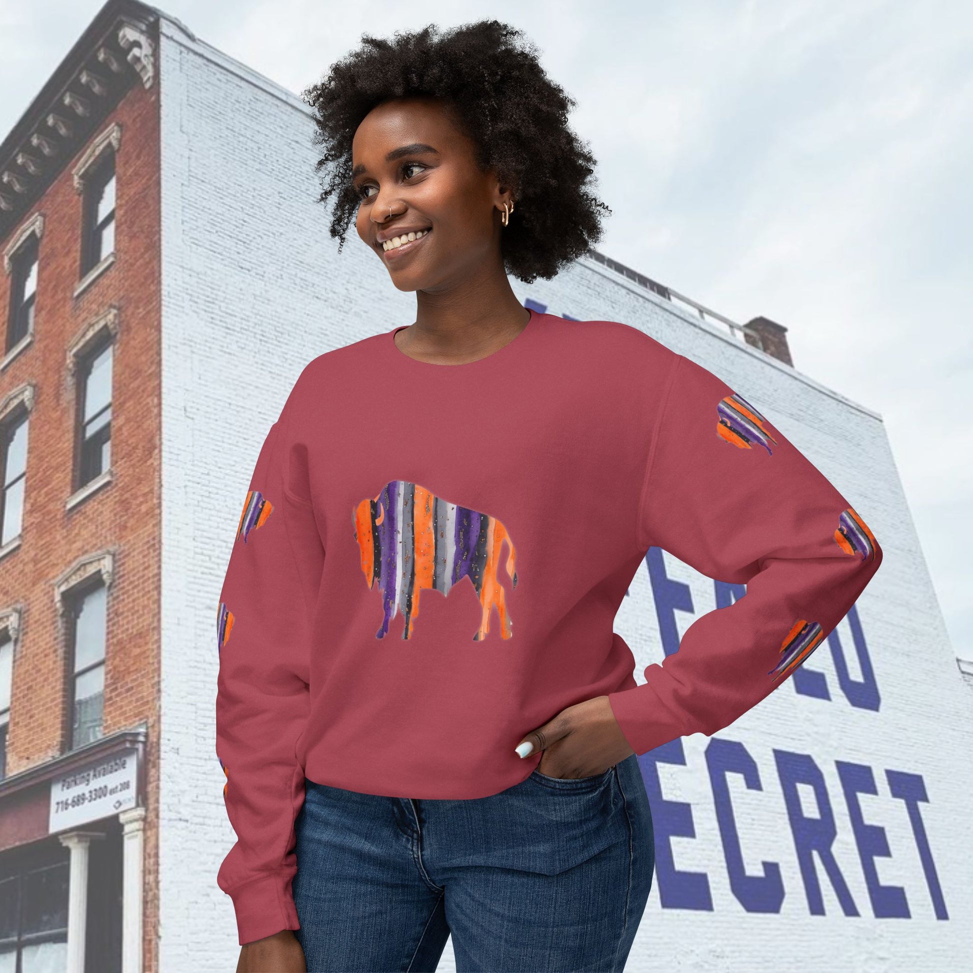 Stay cozy and stylish while repping Buffalo with this one-of-a-kind crewneck sweatshirt! Featuring a beautifully designed watercolor buffalo in the iconic orange, purple, and black colors of the Buffalo Bandits, this sweatshirt is the perfect blend of comfort, durability, and team spirit.