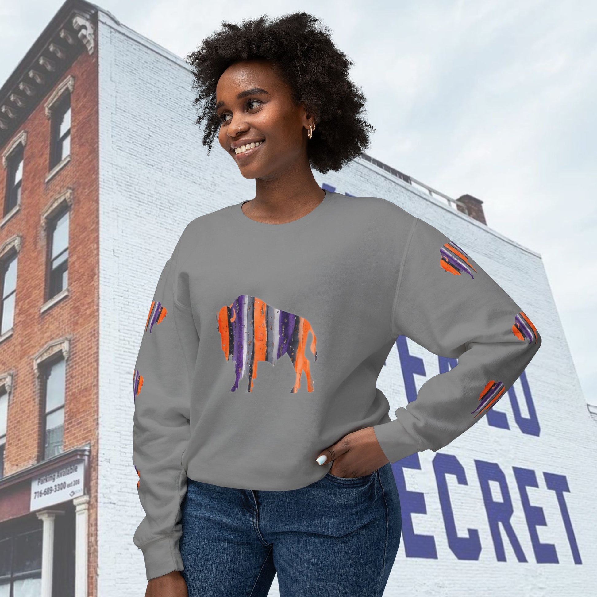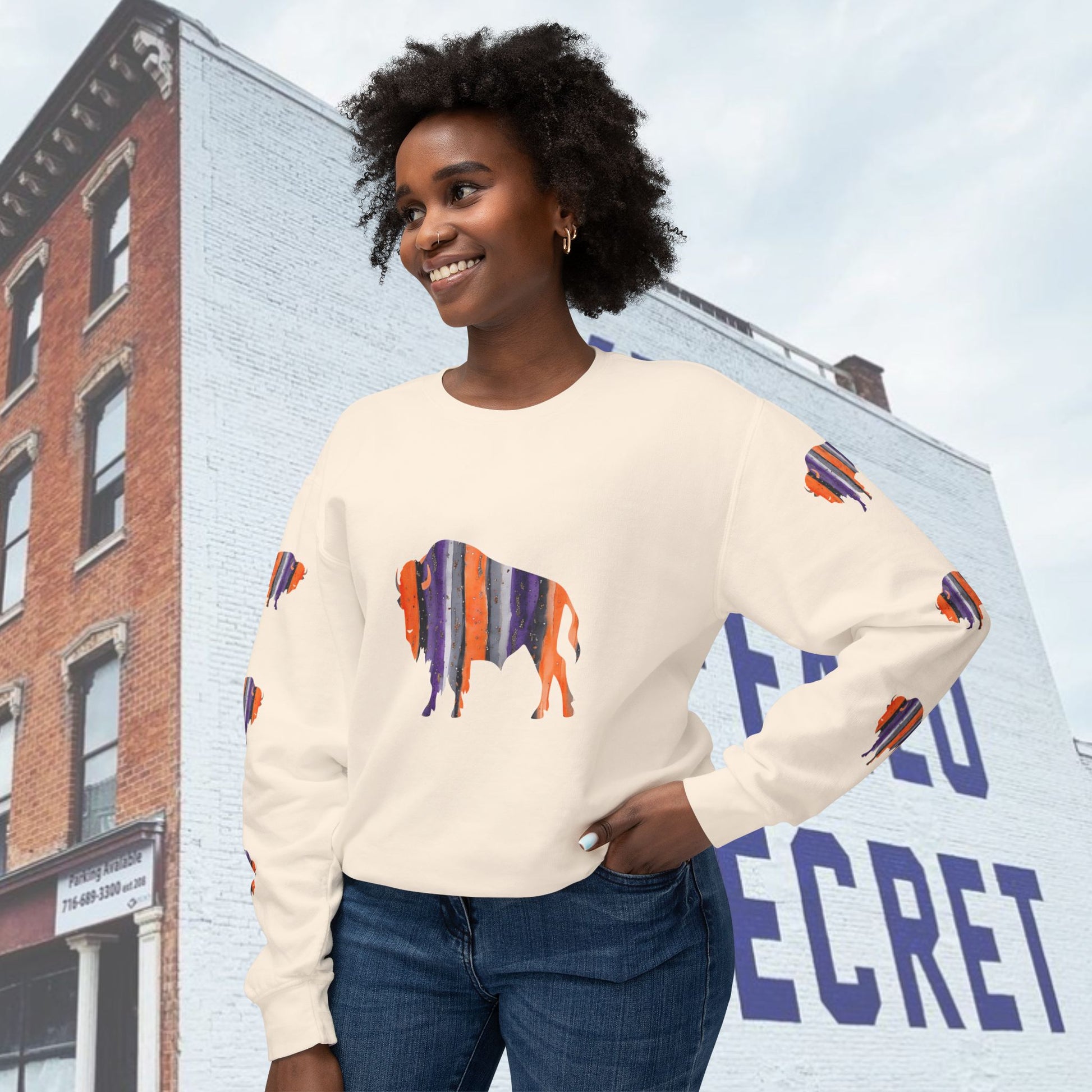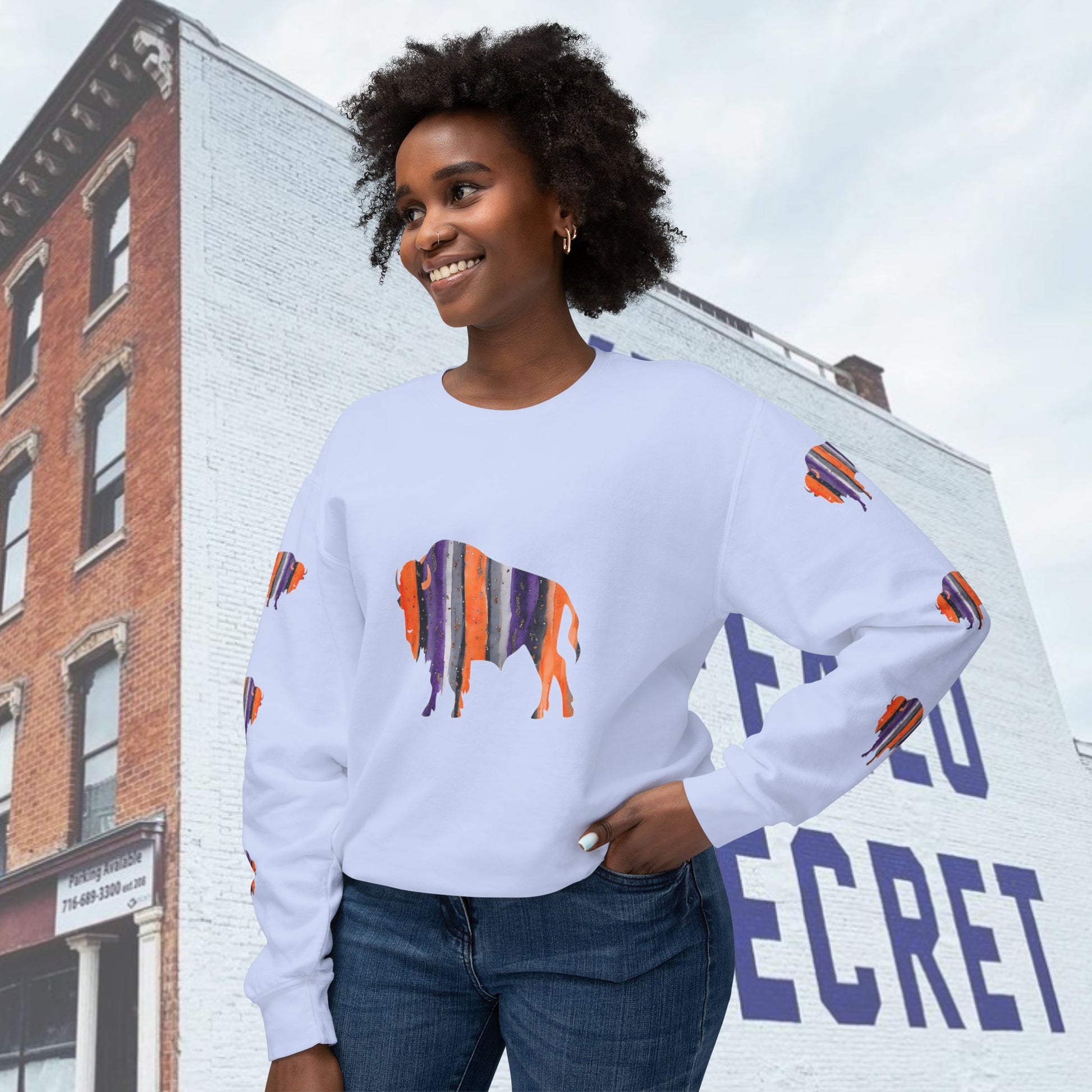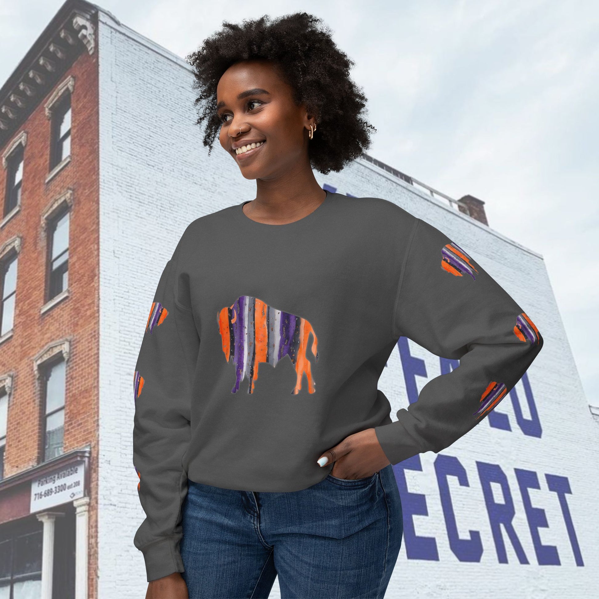 Stay cozy and stylish while repping Buffalo with this one-of-a-kind crewneck sweatshirt! Featuring a beautifully designed watercolor buffalo in the iconic orange, purple, and black colors of the Buffalo Bandits, this sweatshirt is the perfect blend of comfort, durability, and team spirit.